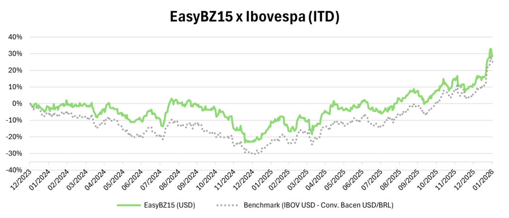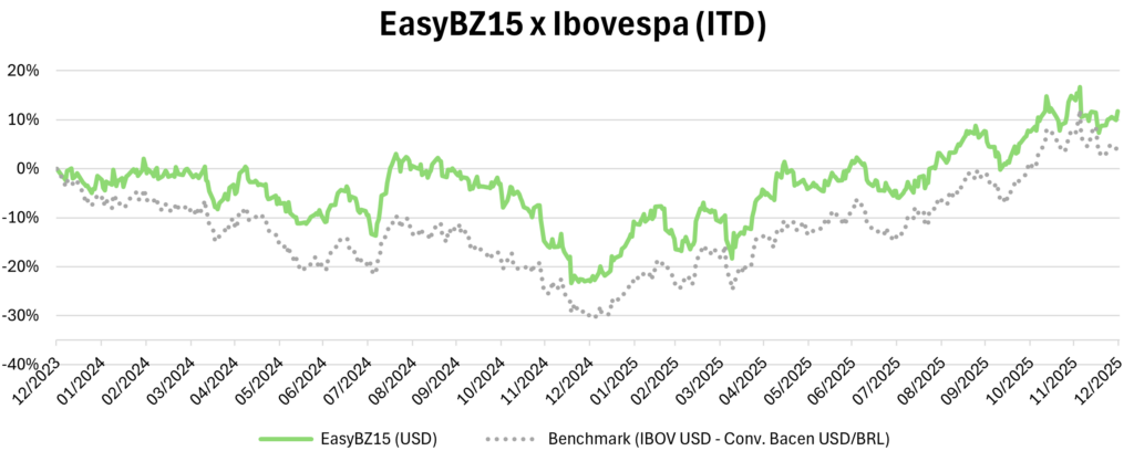 The theoretical portfolio is rebalanced periodically, aligned the GDP release dates by IBGE. The rebalancing process follows the methodology and criteria outlined in the EasyBZ15 INDEX Methodology document.